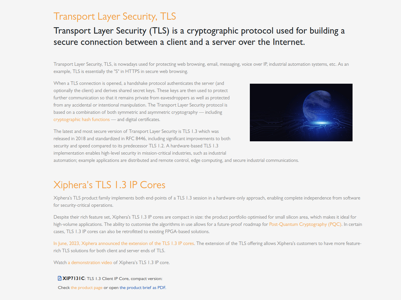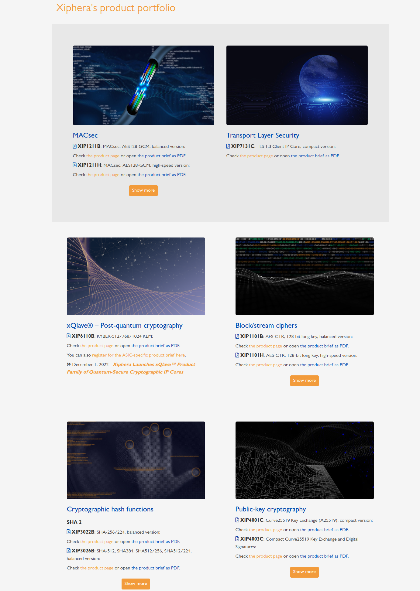 Xiphera categorises its products into Crypto Cores and Crypto Solutions. The former are for individual cryptographic primitives, whereas the latter support complex security protocols and internally use a collection of cryptographic primitives.